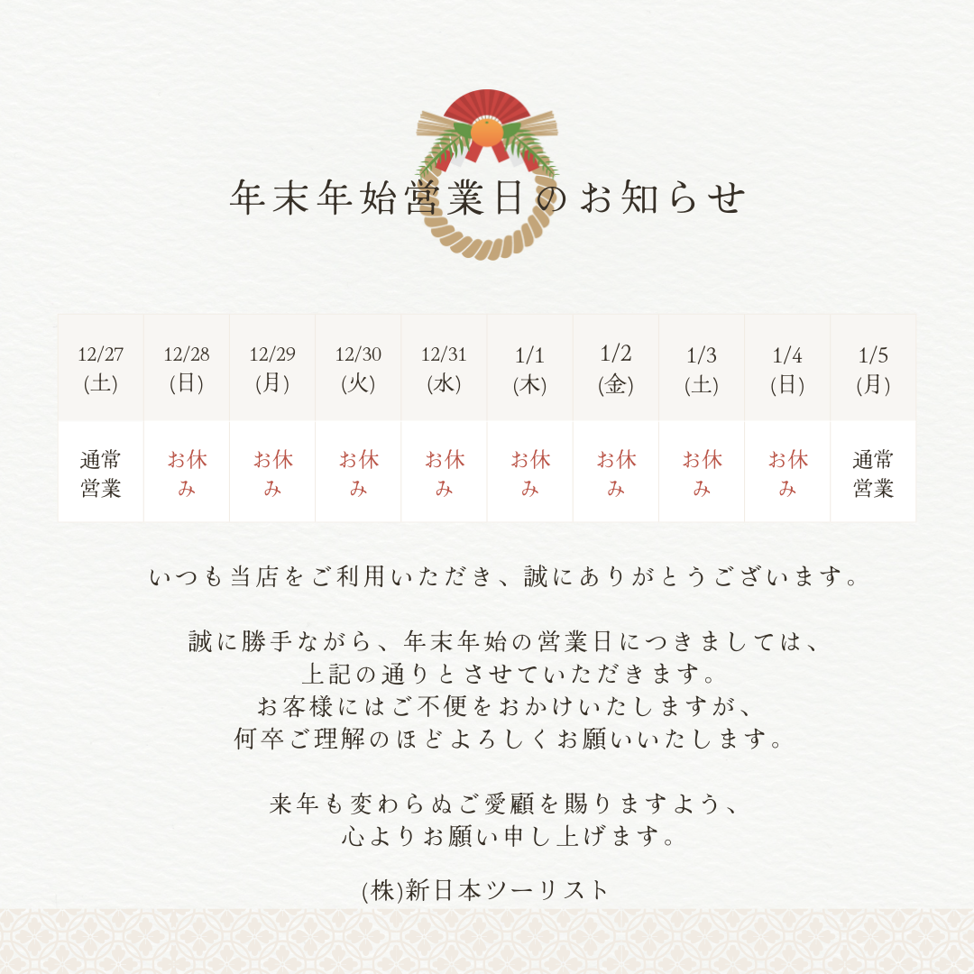お客様各位いつも当店をご利用いただき、誠にありがとうございます。誠に勝手ながら、下記期間を年末年始休業とさせていただきます。■年末年始休業12月28日(日)~1月4日(日)ご来店予定のお客様には、ご不便をおかけいたしますが、何卒ご理解のほどよろしくお願い申し上げます。本年も大変お世話になりました。来年も変わらぬご愛顧を賜りますよう、心よりお願い申し上げます。(株)新日本ツーリスト